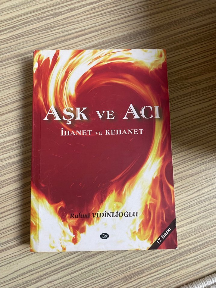 Rahmi Vidinlioğlu'nun 'Aşk ve Acı' adlı romanı, ihanet ve kehanet temalarını işler. Kapakta ateşli bir kalp görseli yer alır.