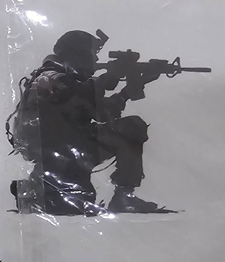 çömelmiş asker pozunda nişan alıyor. Detaylı siluet ve ekipmanlar görülür. 5cm boyutunda laptop termos vs yapılabilir suya dayanıklı