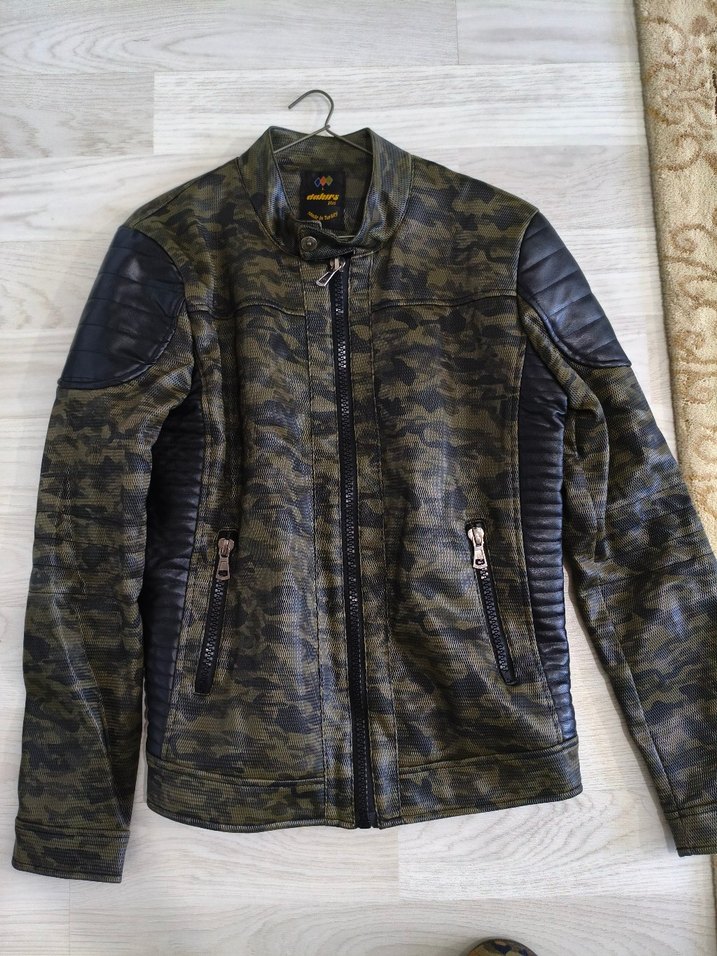 Bu dar kesim biker ceket, asker yeşili kamuflaj deseni ve uzun kollu tasarımıyla dikkat çeker. Deri malzemeden yapılmış, fermuarlı cepler ve kapama içerir, günlük kullanıma uygundur.