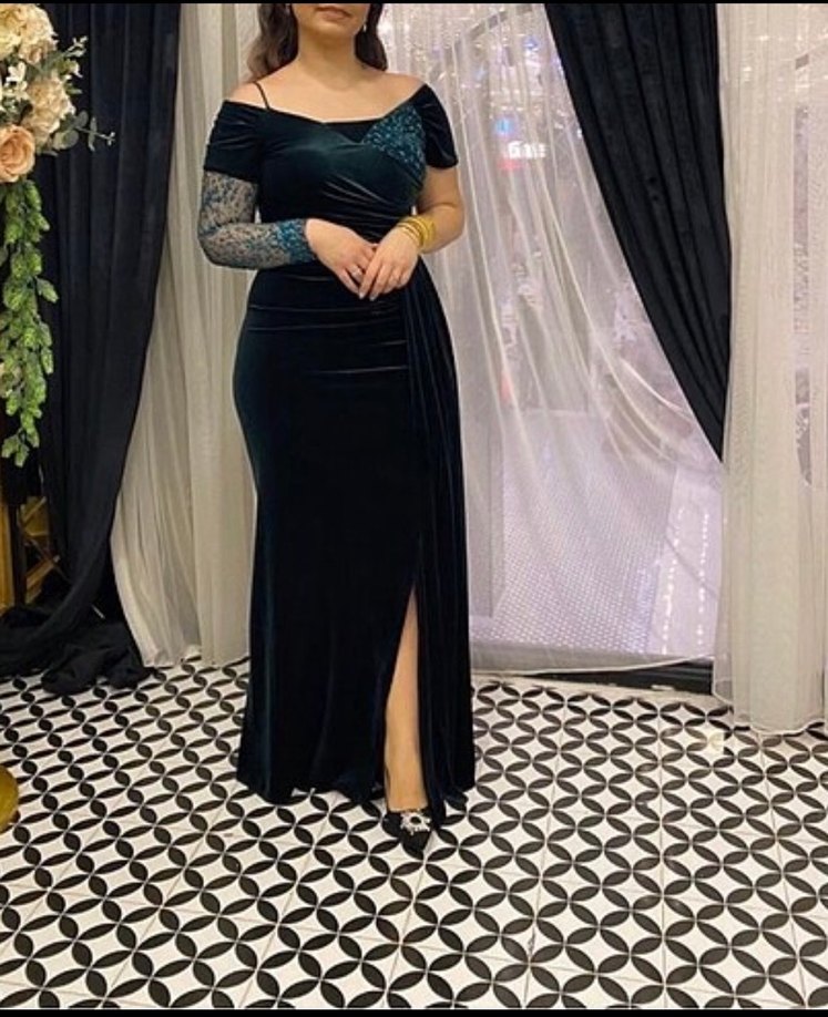 Asker yeşili Uzun Drapeli Kadın Abiye Elbise