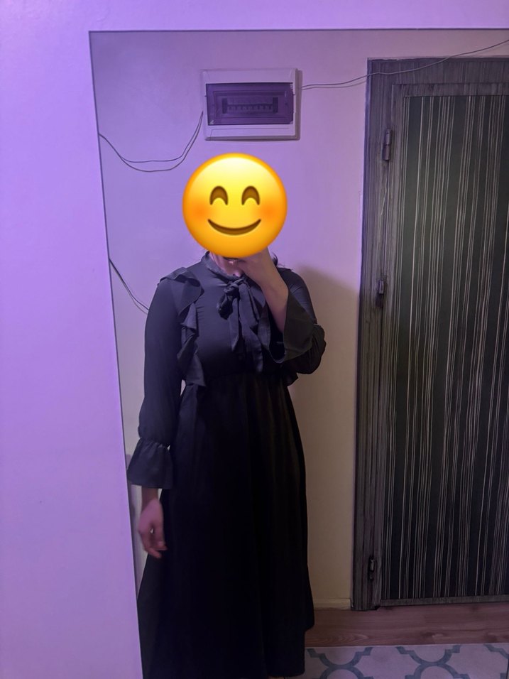 Yüksek yakalı, uzun kollu, fırfırlı ve bol kesim siyah uzun elbise. İpek gibi kumaştan, hafif batik desenli, günlük kullanıma uygun mütevazı bir kere kullandım 36 38 bedene ait