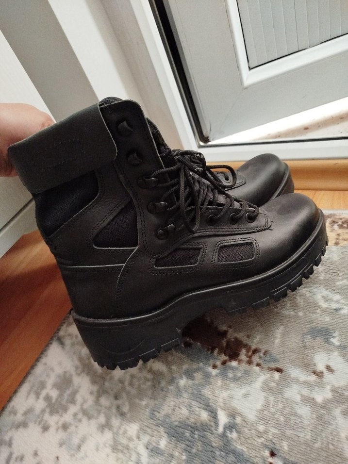 Siyah bağcıklı goth tarzı erkek botları, kamuflaj desenli ve sağlam tabanlı, sokak stili ve günlük kullanım için uygun.örsel askeri bot 1 defa giyildi