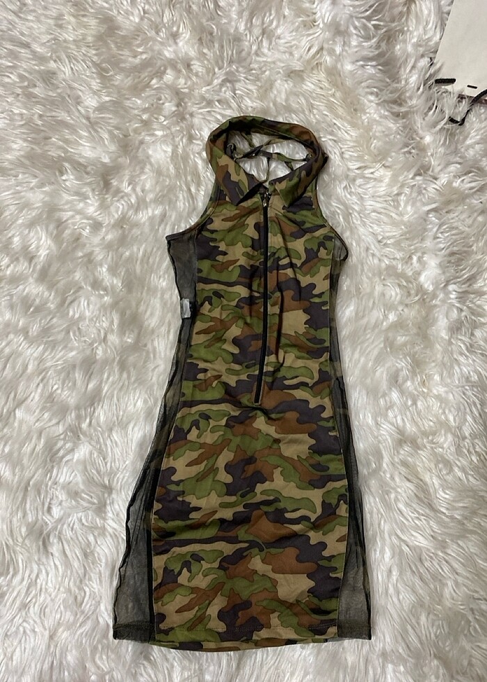 Askeri likralı sırt çaprazlı yanları tüllü kulüp elbisesi