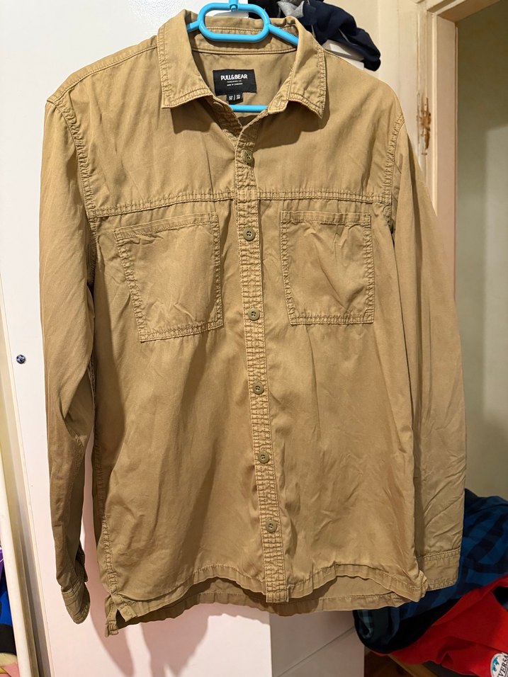 Yeşil sarı arası askeri renkte, uzun kollu, düğmeli ve kesik yaka detaylı erkek gömleği. Rahat kesimi ve keten kumaşıyla günlük sokak stiline uygun.omuz tüm düpmeler kapalı 45 cm boy 70 cm M beden