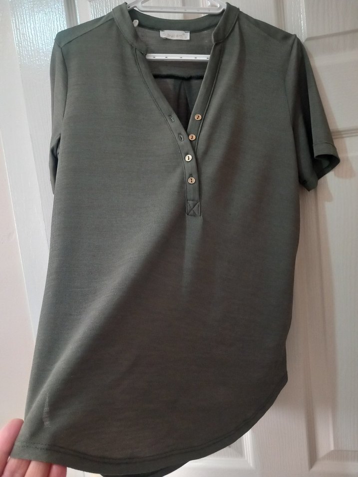Askeri Yeşil renkli, kısa kollu, düğmeli V yaka kadın tişörtü. Rahat kesimi ve yumuşak sentetik kumaşıyla günlük kullanıma uygundur.