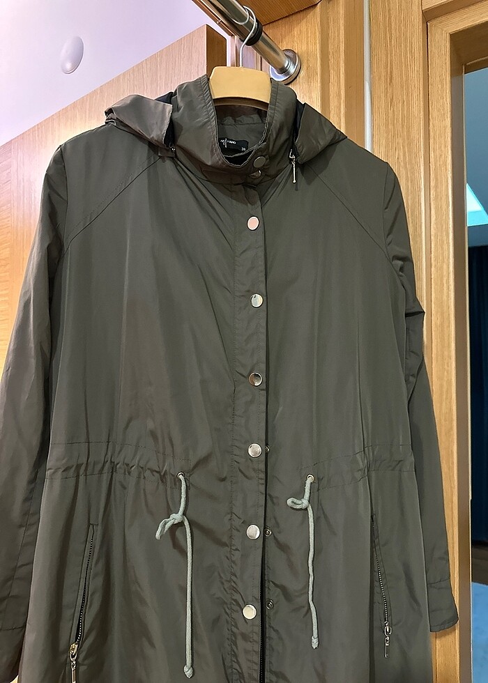 Askeri yeşil 38 beden uyumlu çıtçıtlı ve fermuar detaylı kapşonlu uzun yağmurluk