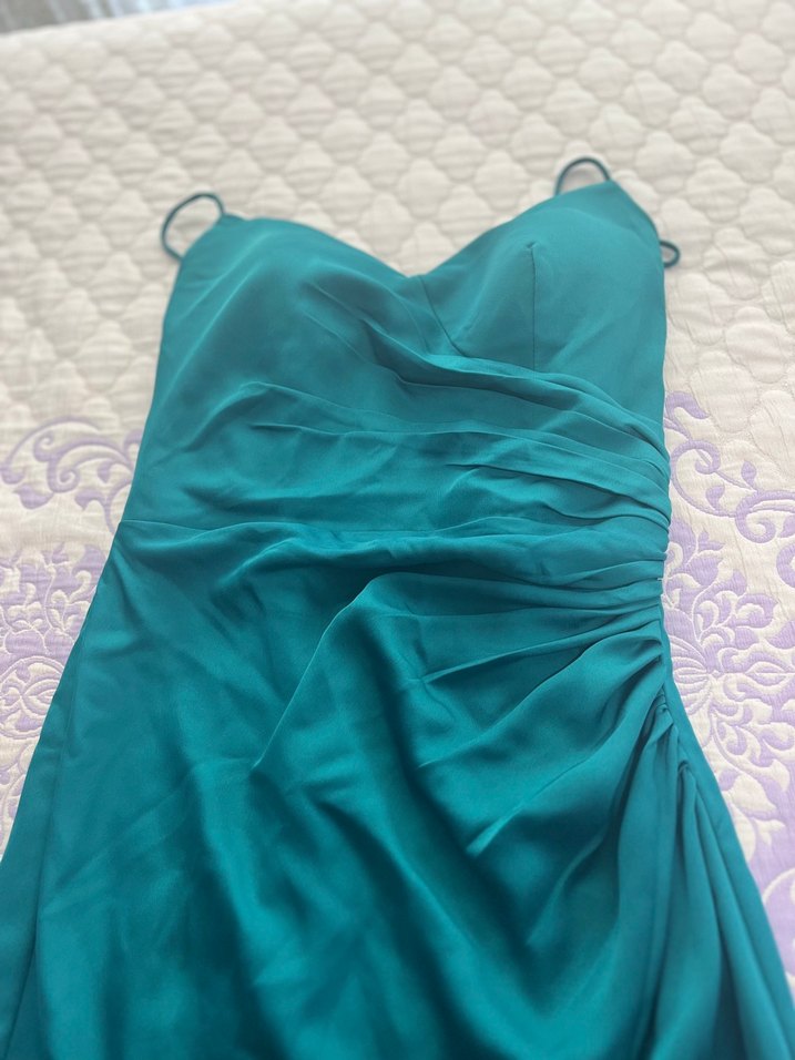 Askılı, drapeli ve parlak turkuaz renkte, uzun ve vücuda oturan bu abiye elbise, düğünler ve çağdaş tarzlar için uygundur.