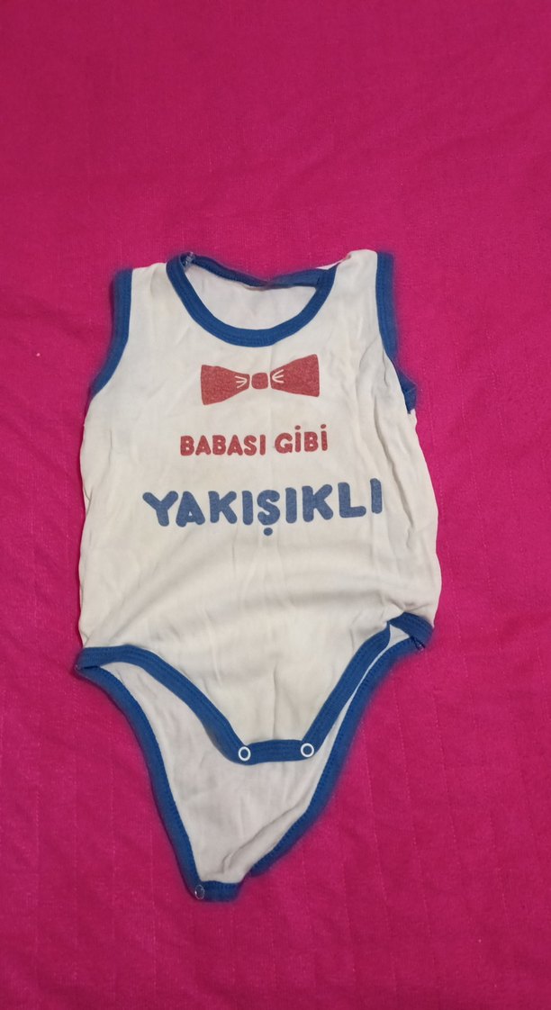 Askı yakalı beyaz bebek body, mavi kenar detaylı, "YAKISIKLI, BABASI GiBi" baskılı ve tokalı kapanışlıdır. cıvıl marka 36.48 ay