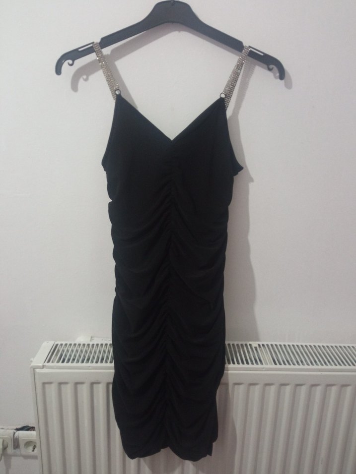 önü arkası ve yanları büzgülü askıları taştan dar mini elbise