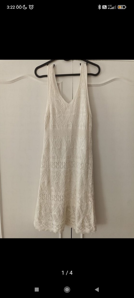 Beyaz, kolsuz, V yakalı, dantel detaylı örgü elbise. Midi boyda, bohem tarzında, günlük kullanıma uygun. rengi krem bej tonlarinda