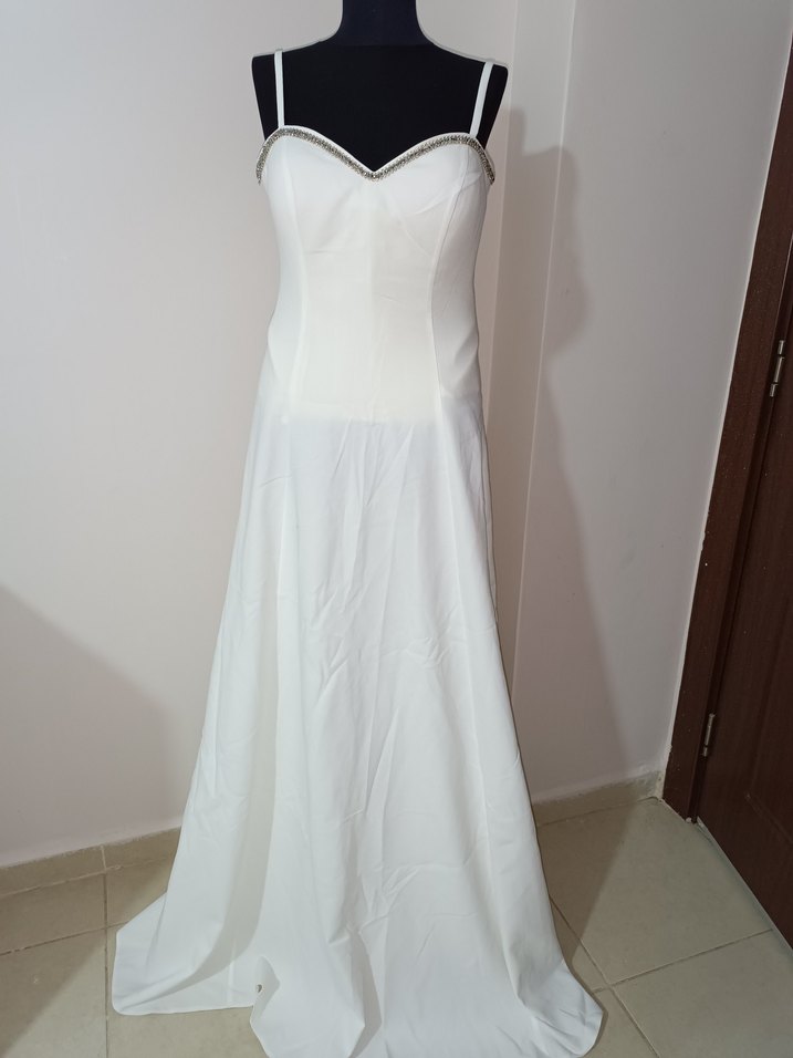 Bu beyaz A kesim Abiye, askısız yaka ve uzun boy özelliklerine sahiptir. Modern klasik tarzda, düzenli kesim ve kolsuz tasarıma sahiptir. Minimalist şıklık sunar. 38-44 bedene uygundur