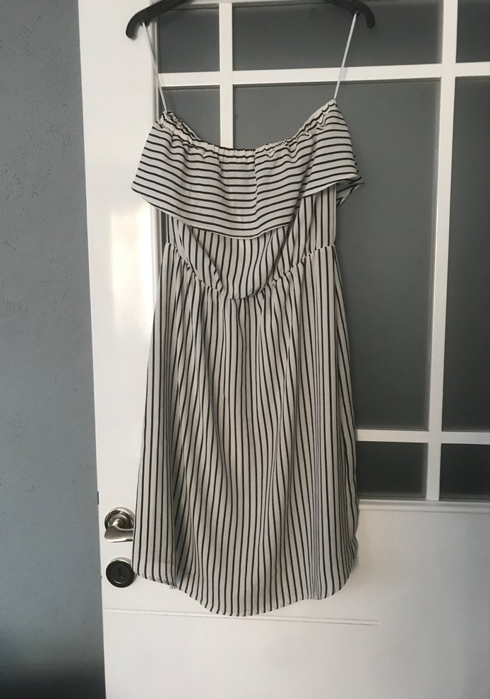 Askılı, pileli detaylı, beyaz ve gri çizgili midi boy bol kesim elbise. Yumuşak sentetik kumaştan, günlük sokak stili için uygun.