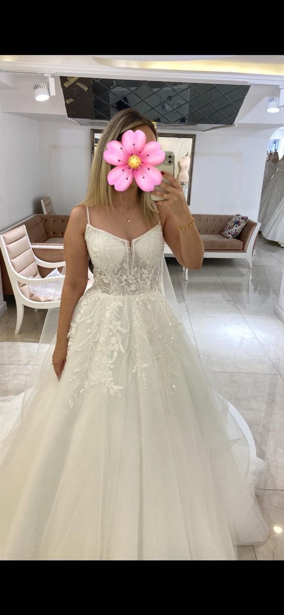 S-M uyumludur. Arkası iplidir. Askılı, straplez yaka ve ince askılı beyaz A kesim gelinlik. Dantel detaylı, midi boy ve klasik bohem tarzda, şık ve zarif. Kuru temizleme yapılmıştır. fiyatta yardımcı olucagım