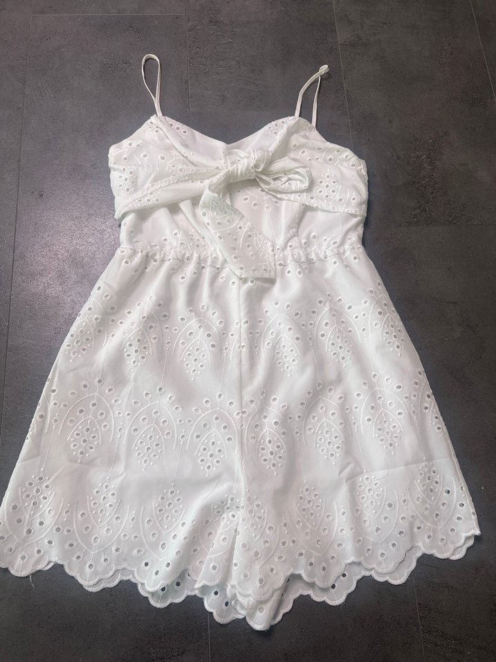 Ürün yeni ve etiketlidir rahat kesimdir S bedendir son görselde ölçüm tablosu mevcuttur Beyaz mini tulum, ince dantel nakışı, dar kesim ve ince askılarla bohem ve retro düğünler için uygun.