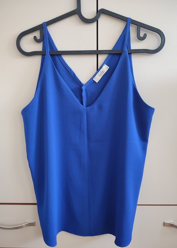 Şifon, dökümlü, askılı bluz. Saks renginde.
