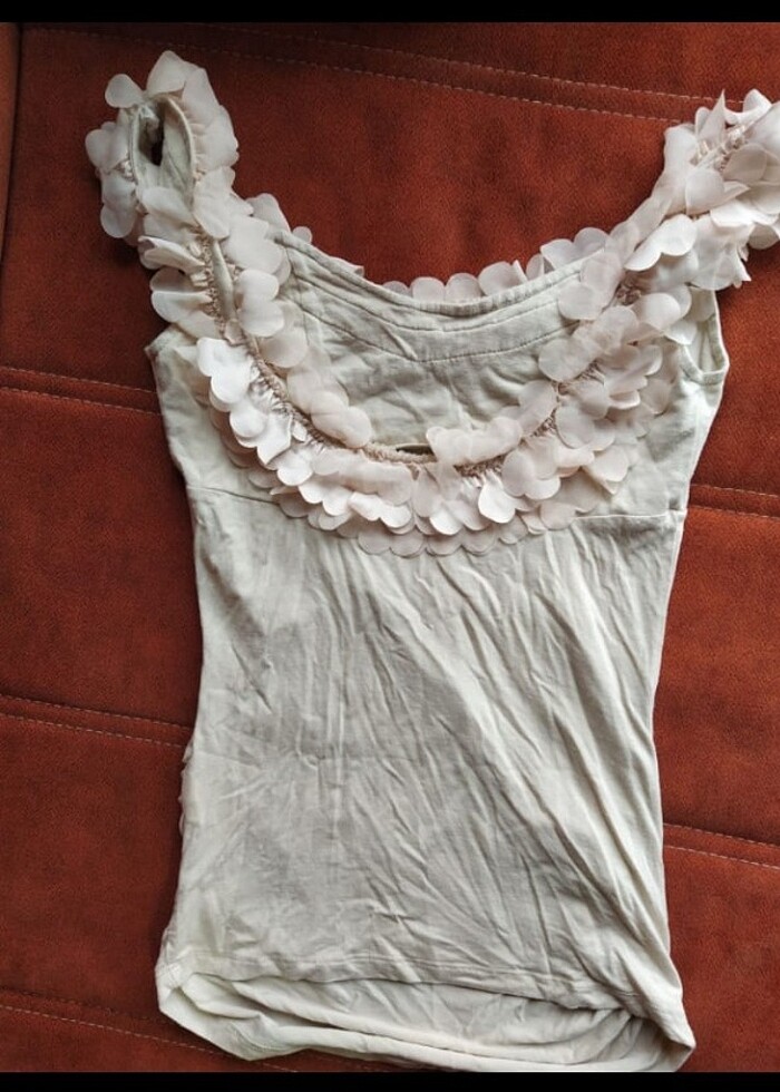 Yakası fırfır detaylı askılı 38-40 beden uyumlu yaka çicek detaylı şık penye bluz