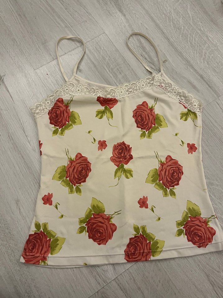 Dantel detaylı, beyaz çiçek desenli, askılı ve vücuda oturan bluz. Yumuşak sentetik kumaştan yapılmıştır, bohem tarzı için uygundur.