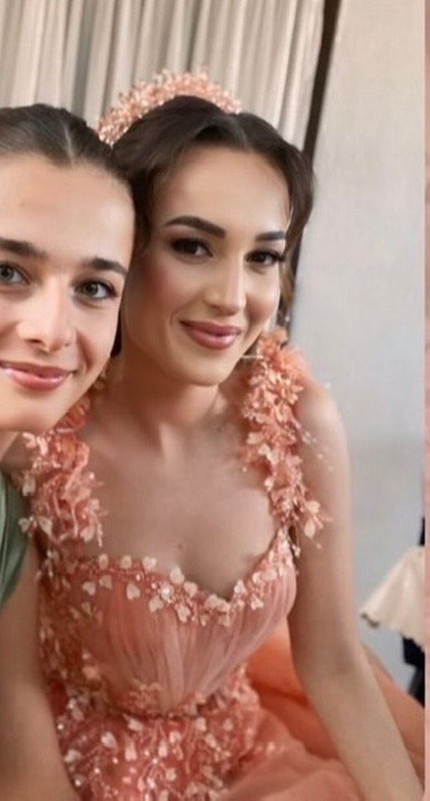 Pembe pastel tonlarında, straplez yakalı, dantel çiçek detaylı, kısa ve vücuda oturan nişan elbisesi. Bohem tarzıyla şıklık sunar.