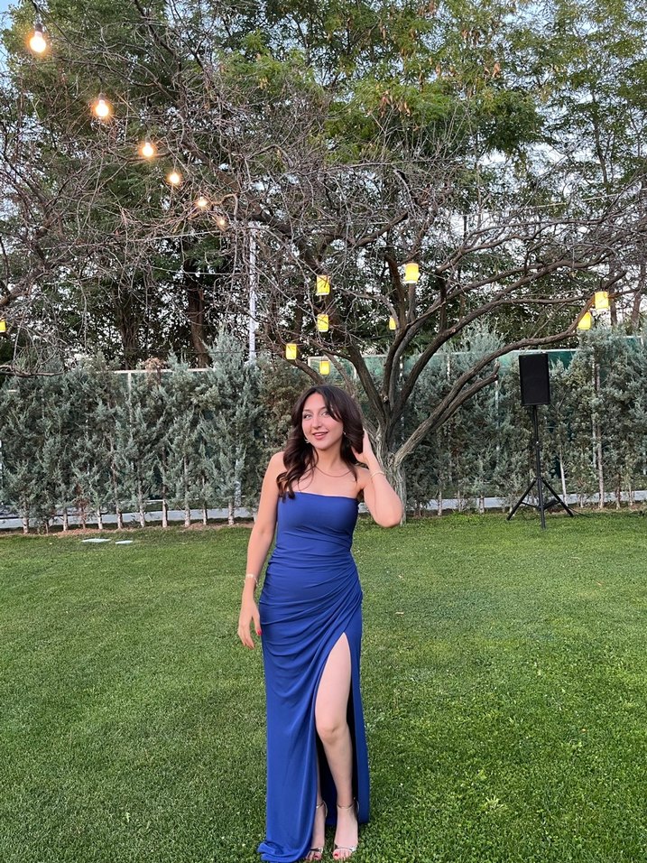 Drapeli ve askılı, straplez midi elbise. Parlak mavi renkte, vücuda oturan ve yırtmaçlı tasarımıyla dikkat çeker. Minimalist ve cesur parti tarzına uygundur.