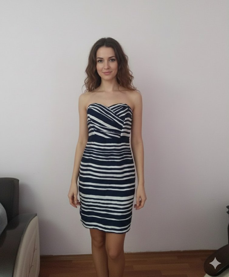 Lacivert-beyaz zebra desenli, askılı ve drapeli, sentetik kumaştan yapılmış, vücuda oturan mini elbise. Romantik akşamlar için uygun.