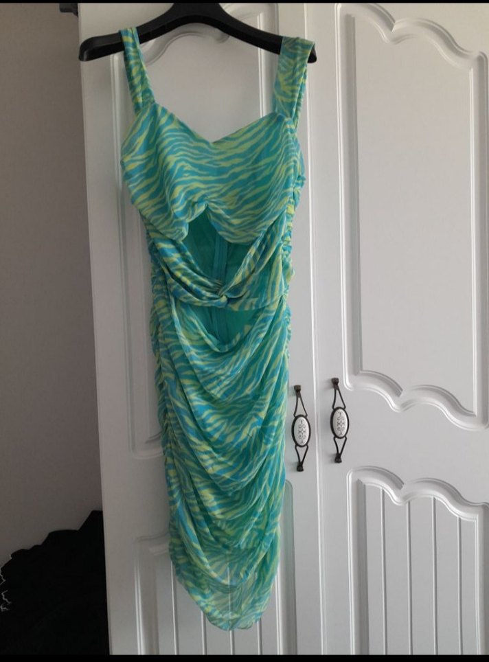 Askılı, drapeli ve fitted kesime sahip uzun elbise, açık turkuaz tie-dye desenlidir ve avant-garde tarzı yansıtır. ✨