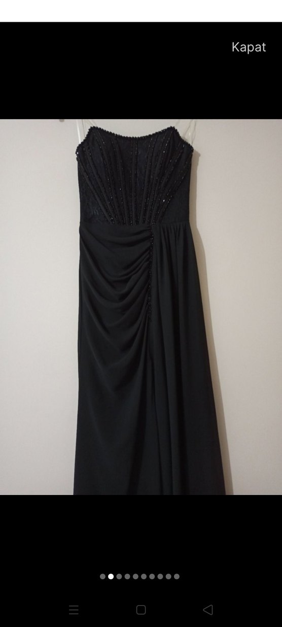 Siyah, askılı ve drapeli uzun abiye elbise, vücuda oturan kesimi ve kolsuz tasarımı ile düğünler için uygundur. Gotik tarzda klasik bir şıklık sunar.