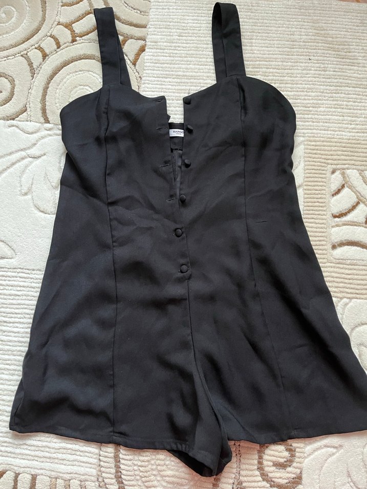 Düğmeli, kolsuz siyah midi tulum, günlük kullanım için uygun, gövdeyi saran kesimli ve Parisli gotik tarzında. Boyu 60 cm civarı