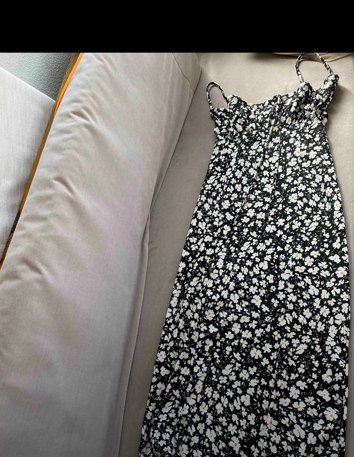 Siyah renkli, ince askılı, straplez yakalı ve fırfırlı uzun elbise. Çiçek desenli,