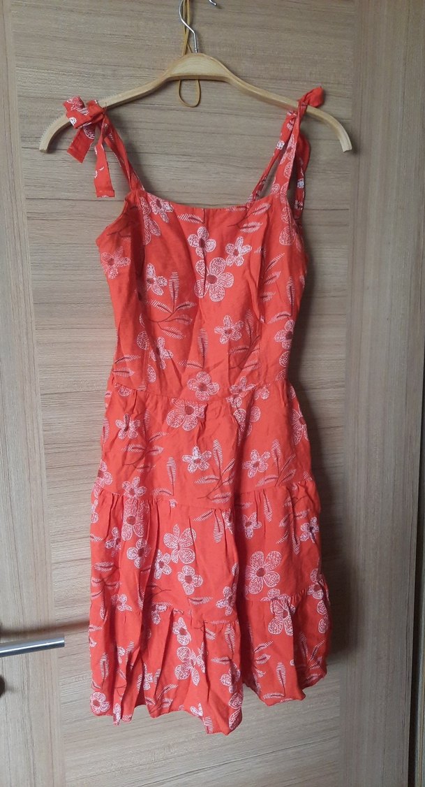 Askılı, vücuda oturan midi elbise, straplez yaka ve fırfır detaylara sahiptir. Pastel kırmızı çiçek desenli, sentetik kumaştan yapılmıştır.