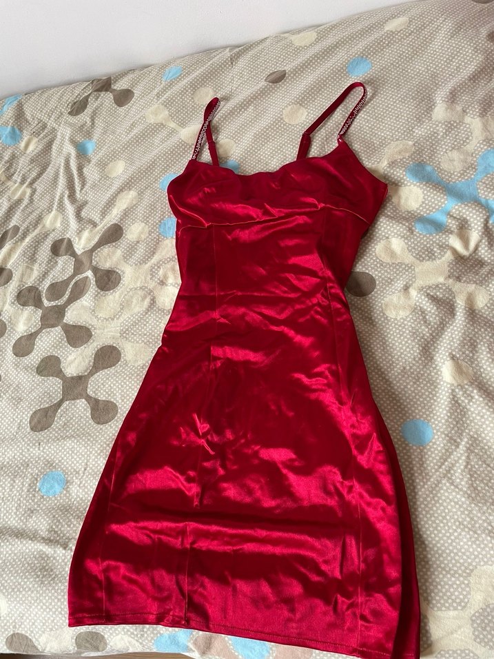 parlak saten kırmızı elbise çok hafif tırnaktan dolayı kalkmış yeri var ama belli olmuyor