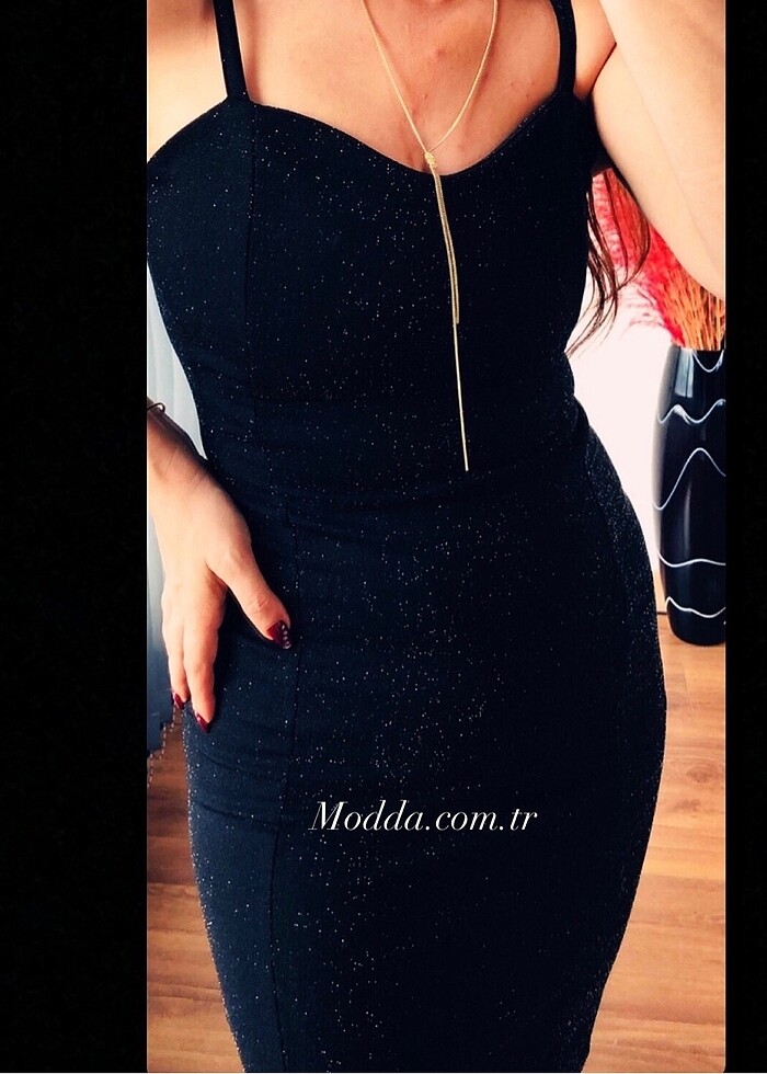 Askılı kendinden simli esnek kumaş çok rahat midi boy siyah elbise