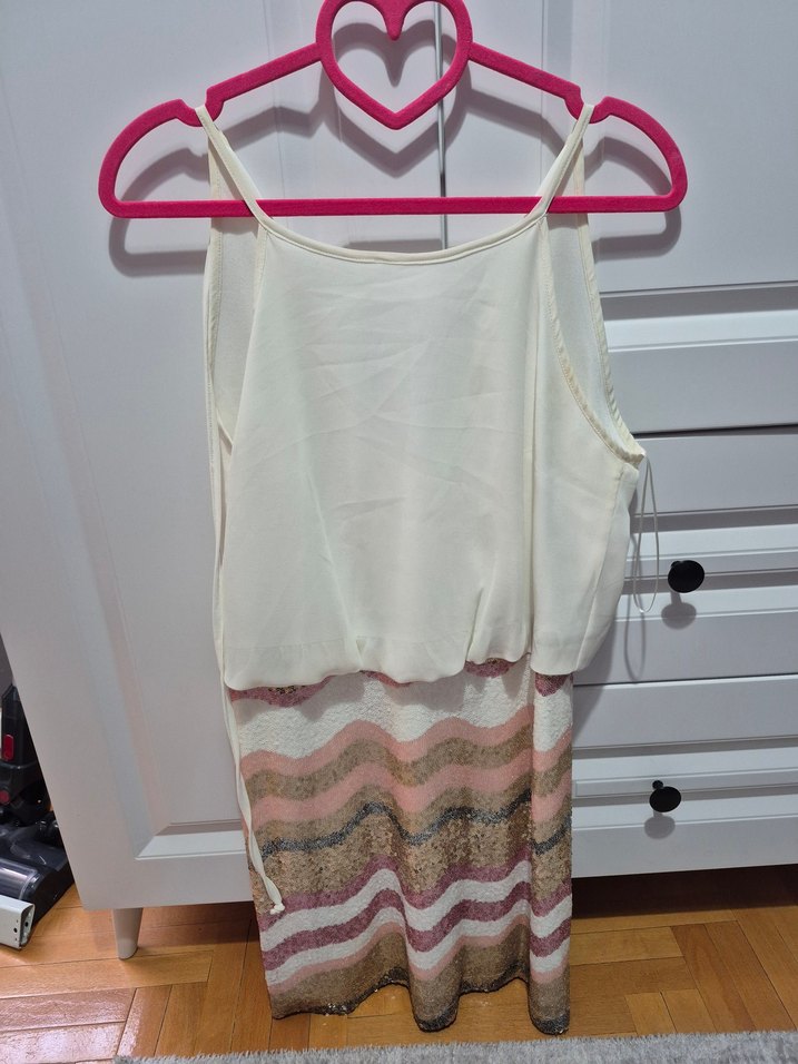 Askılı, mini pullu elbise. Kısa boy, hafif tonlarda batik desenli, bohem parti stiline uygun. 1 kez giyildi