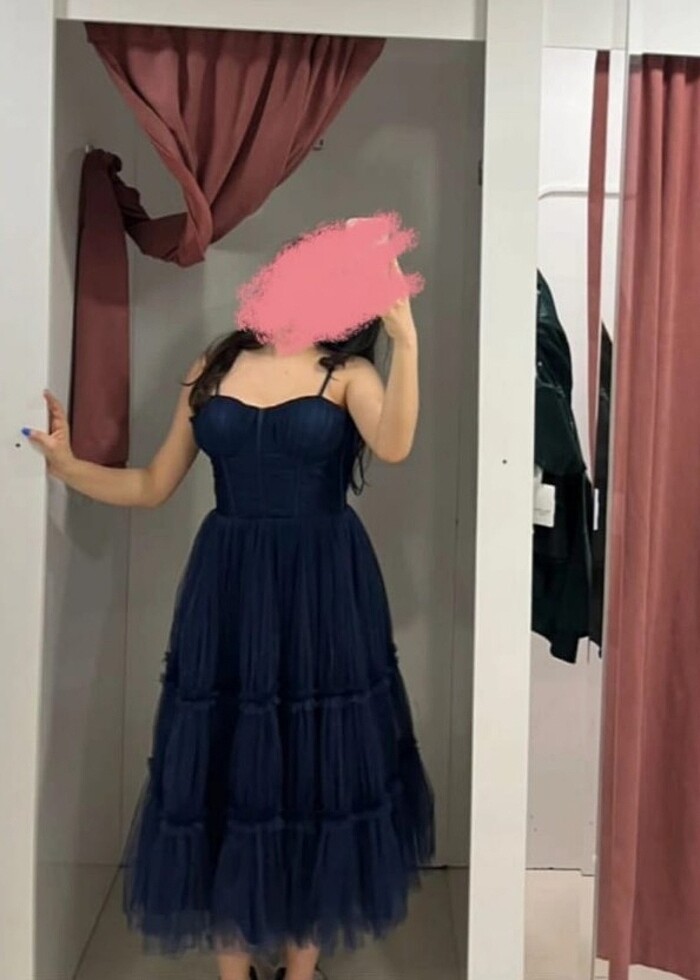 Askılı lacivert midi boy abiye elbise