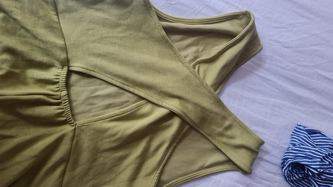 Yumuşak sentetik kumaştan, V yaka ve askılı kollu, fitted kesim limon küf ü askılı elbise Drapeli tasarım ve midi boy, günlük kullanıma uygun athleisure tarzında.