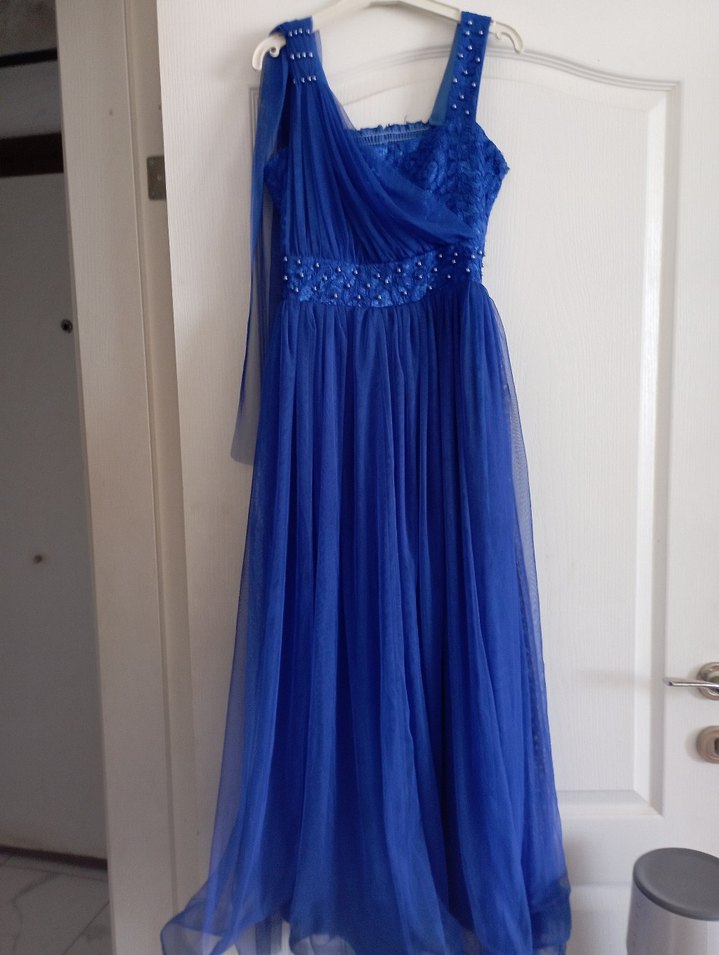 Askılı, uzun mavi elbise, straplez yaka ve bol kesim ile bohem düğün tarzını yansıtıyor. Kolsuz ve desensiz, avangart ve modaya uygun görünüme sahip.