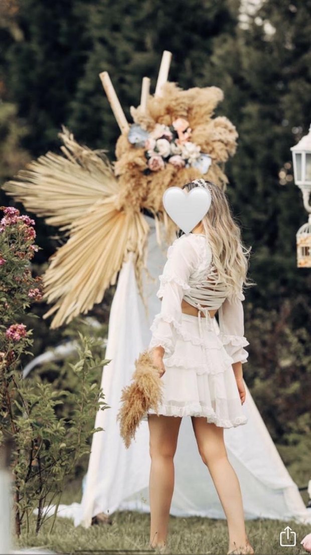 Askılı ve halter yakalı, beyaz mini bohem gelinlik. Hafif ve şık yapısıyla rahat bir dış mekan düğünü için uygundur. Sadece iki defa 2-3 saatliğine kullanılmış özel dikim elbisedir.
