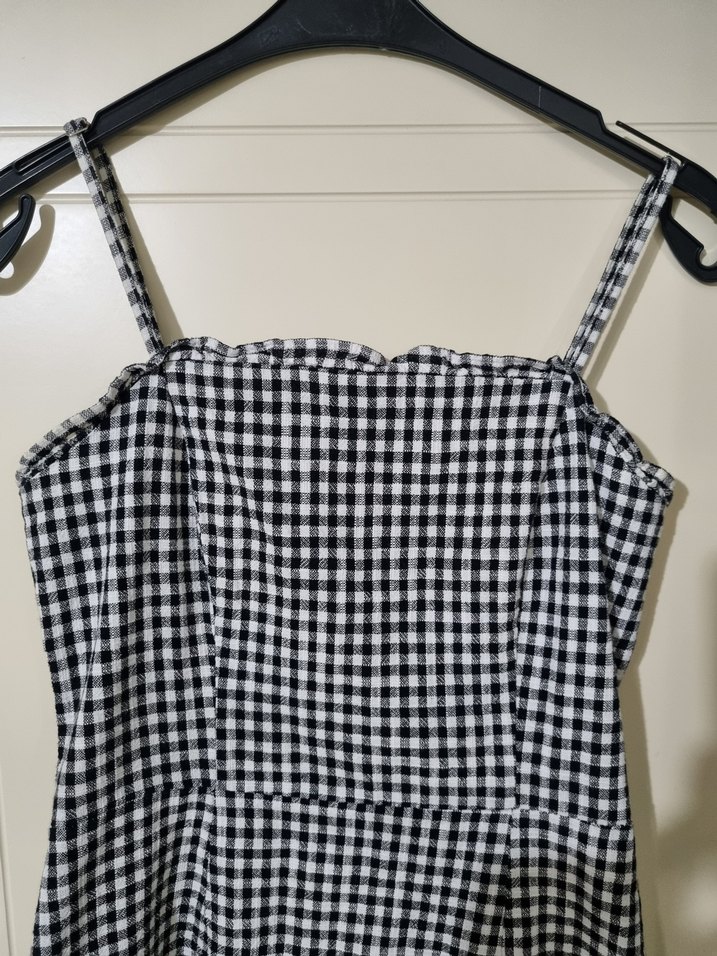 Koton marka, 34 beden, pötikare desenli arkadan fermuarlı askısı ayarlanabilir kısa elbise. Kırışıklık belli etmeyen kumaşa sahiptir.