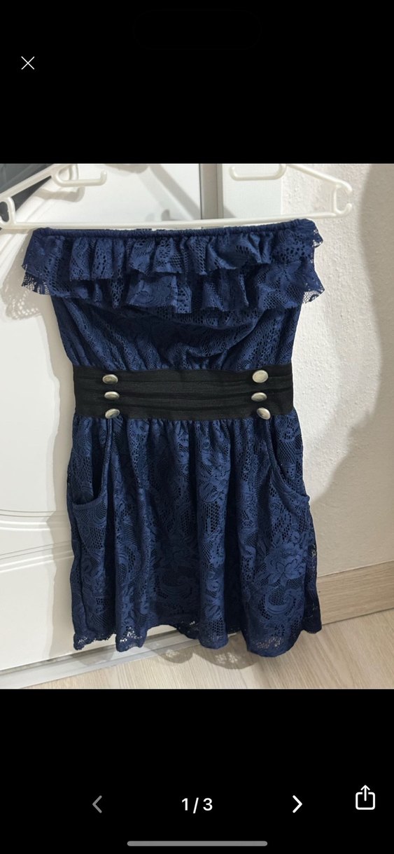 Lacivert dantel desenli straplez mini elbise, fırfırlı yakaya ve düğmeli kemer detayına sahiptir. Cep ve dar kesimiyle Paris tarzını yansıtır.