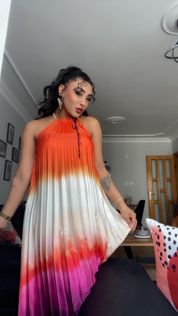 Askılı, piliseli uzun elbise, straplez yakalı ve bol kesim. Çok renkli parlak batik desenli, sentetik kumaştan bohem tarzı yansıtıyor.
