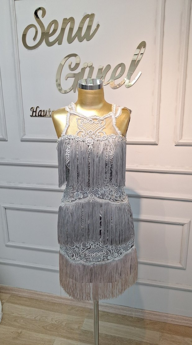 Fitted kesim, askısız, işlemeli ve boncuklu püsküllü detaylara sahip bohem tarzda gri midi boy abiye elbise. Sadece 1 kez giyildi. Etek ucundaki püsküllerde renk değişimi olduğu için uygun fiyata konuldu. 34/36 bedene uygundur. Arkası ip ve düğme detaylıdır. Özel dikimdir. Püsküller ve danteller el işidir.