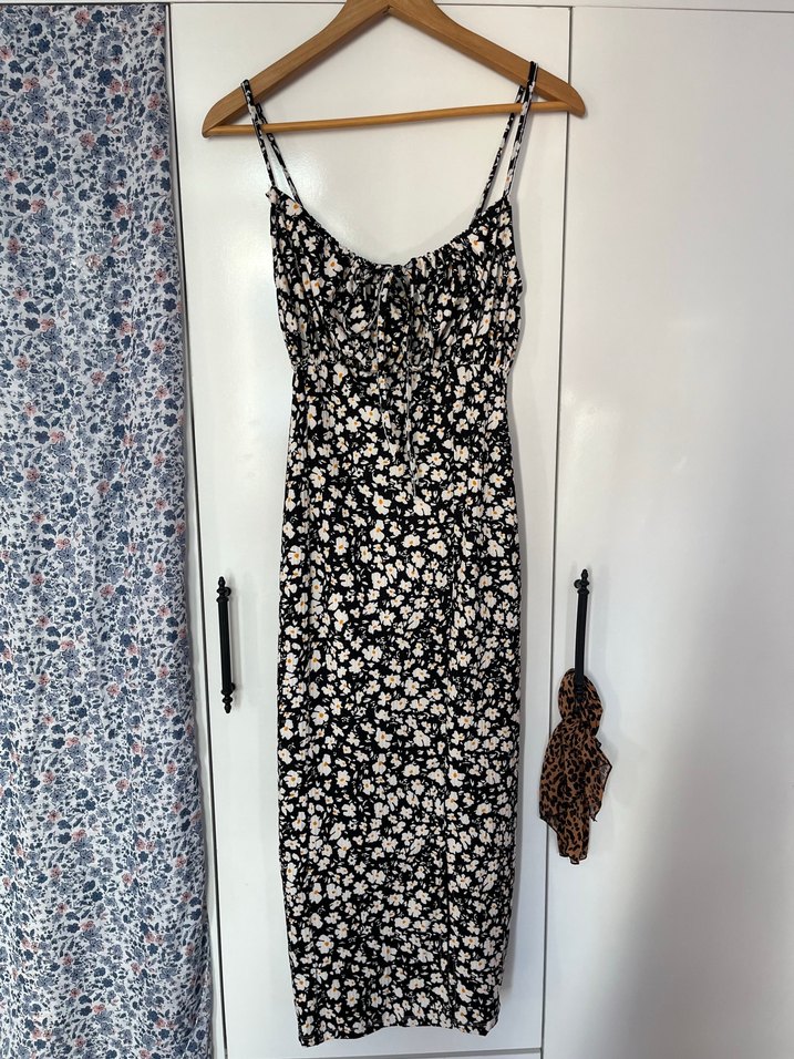 Askılı, vücuda oturan uzun elbise, sentetik kumaş ve koyu renkli çiçek desenine sahip, günlük kullanım için uygun.
