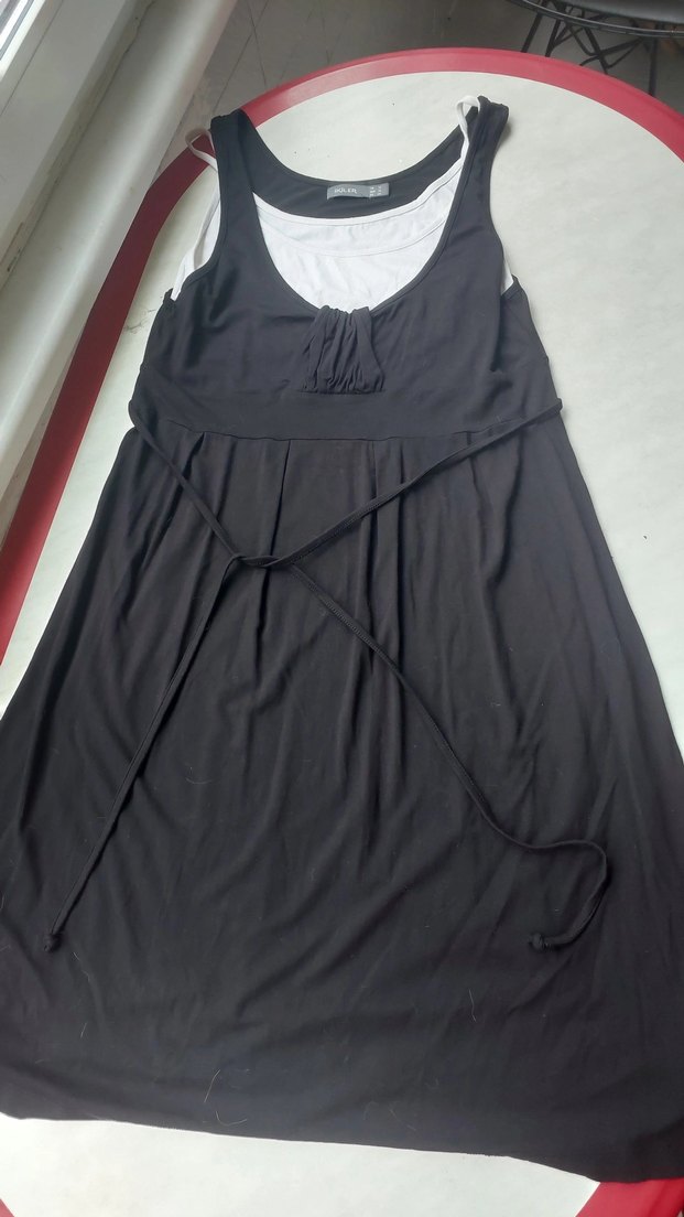 Siyah hamile midi elbise, askılı ve straplez yakalı, dökümlü detaylı. Yumuşak sentetik kumaştan, günlük kullanım için uygun minimal goth tarzda.