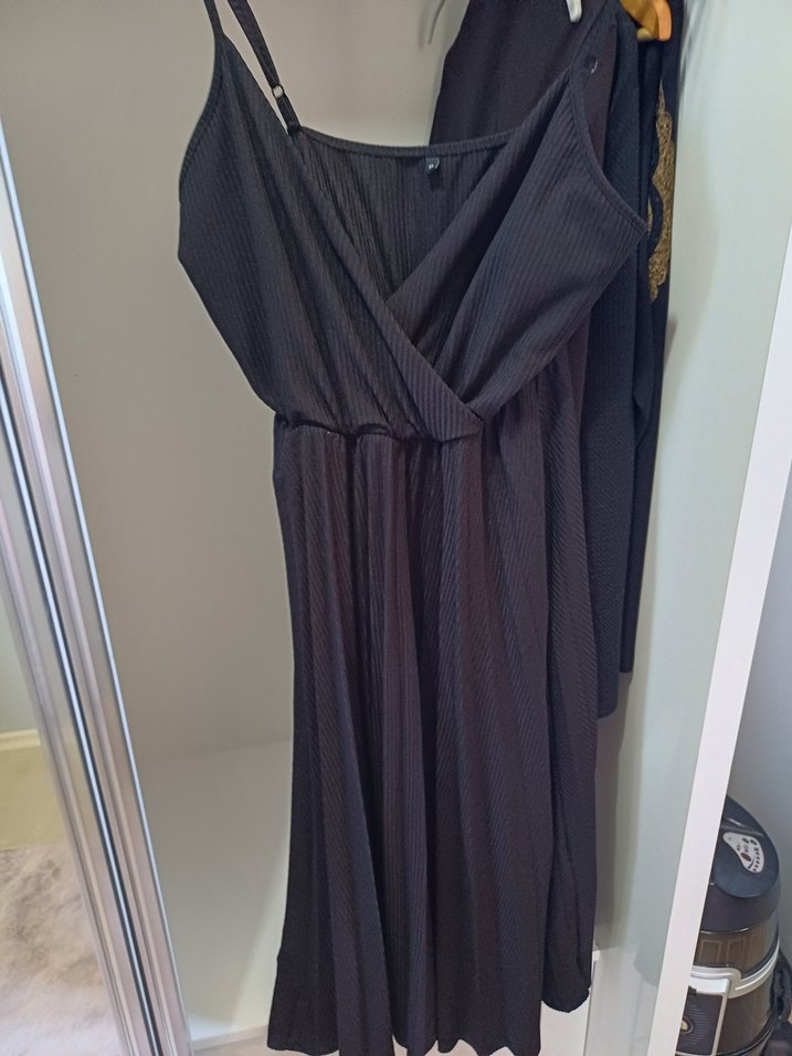 Siyah, piliseli uzun elbise, askılı ve V yaka tasarıma sahip. Rahat kesimli ve sentetik kumaştan üretilmiştir, ofis kullanımı için uygundur.