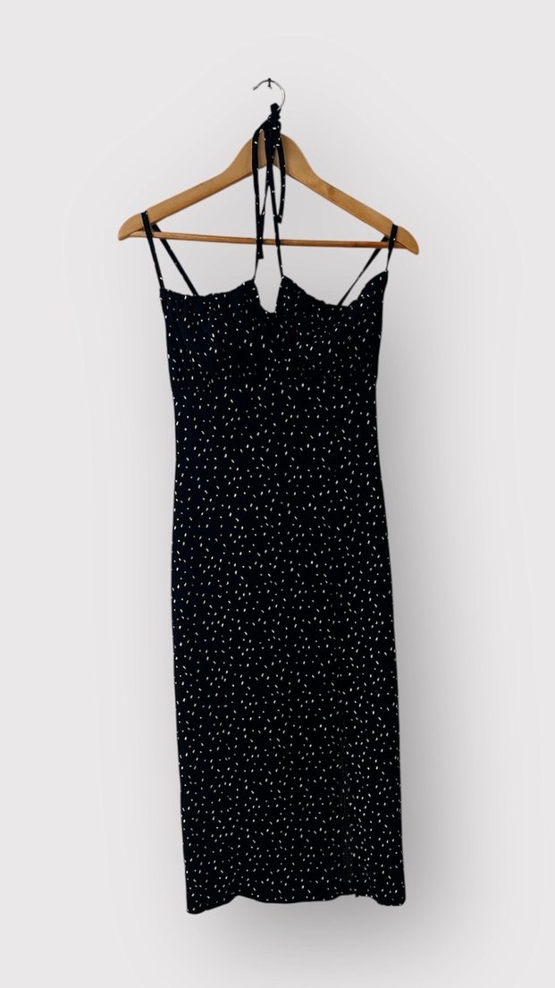 Askılı Siyah Puantiyeli Elbise İnce Askılı, Yırtmaçlı