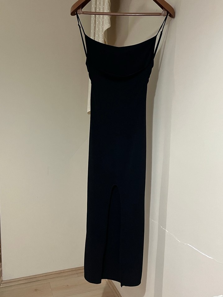 Siyah uzun, straplez ve ince askılı, drapeli detaylı dar kesim elbise. Minimalist ve gotik tarzda, romantik akşamlar için uygun. Yumuşak sentetik kumaştan.