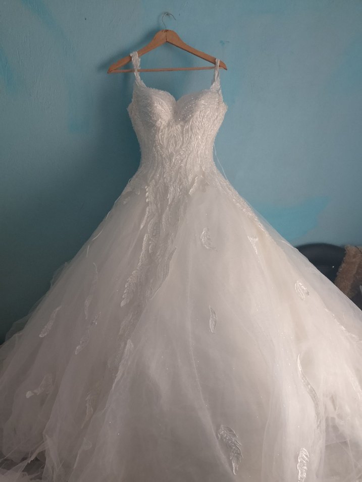 Bu beyaz A kesim gelinlik, straplez yaka ve ince askılı kollarla tasarlanmıştır. Uzun etek, klasik ve minimalist bir görünüm için zarif detaylar içerir. s m beden temiz