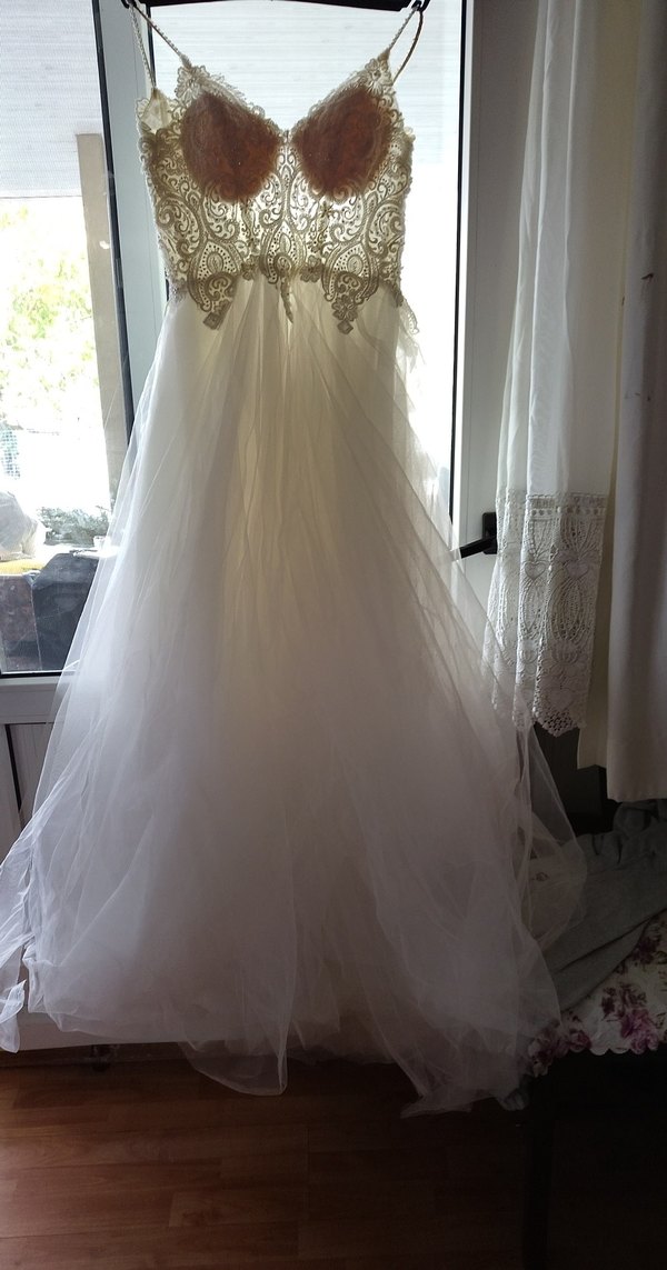 Askılı, straplez yakalı, uzun etekli, beyaz renkli, vintage dantel detaylı ve modern klasik tarzda prenses kesim gelinlik. Klasik şıklık için ideal. kasnağida mevcuttur beden olarak s yazdım ama M beden de giye bilir arkası ayarlanmalıdır