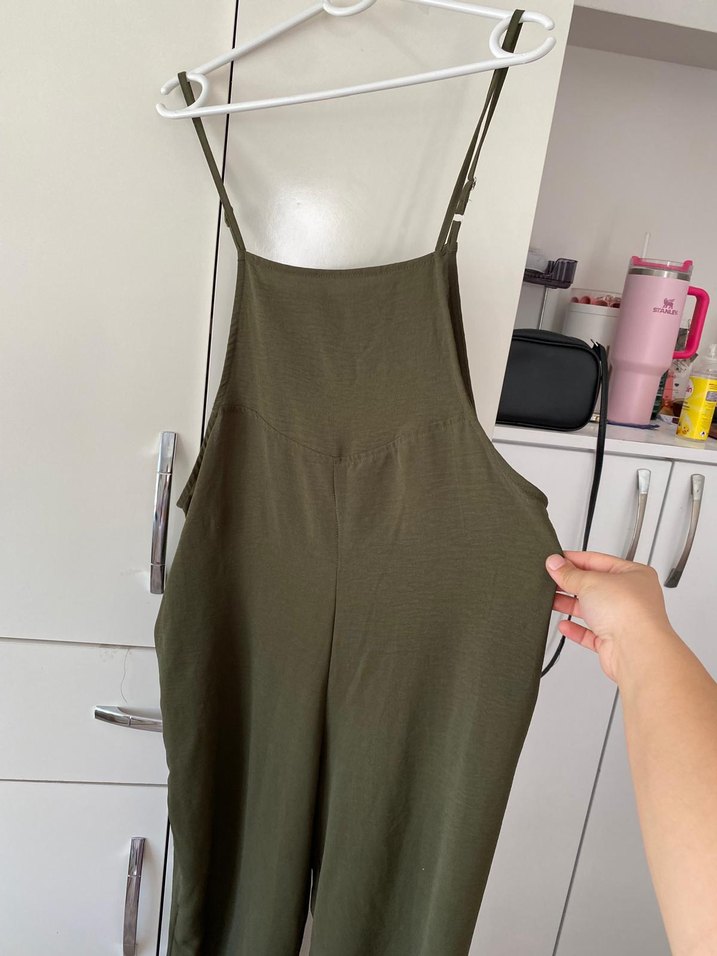 Askılı, tokalı haki hamile tulum, straplez yaka ve bol kesimdir. Midi boyda, yumuşak sentetik kumaştan üretilmiştir, günlük kullanıma uygundur.