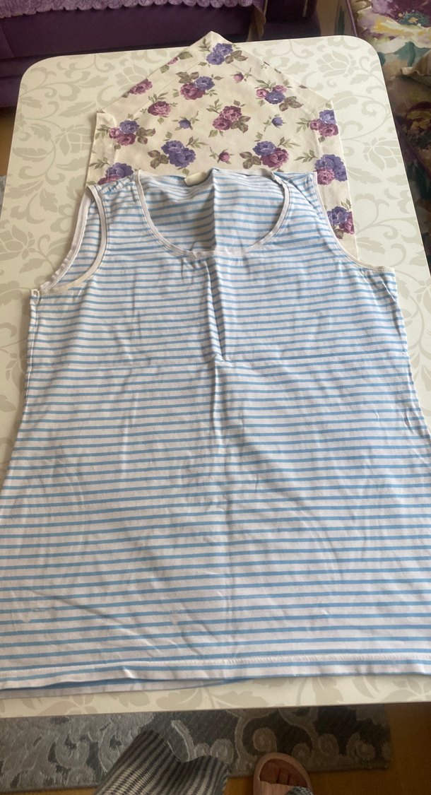 mavi ve beyaz ince çizgili, kolsuz ve yumuşak dokulu