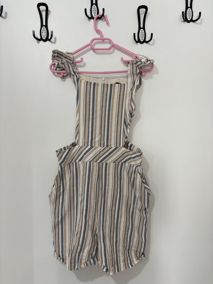 Fırfırlı askılı, vücuda oturan tulumu, yumuşak sentetik kumaştan yapılmıştır. Bej ve gri çizgili deseniyle sokak stiline uygundur.
